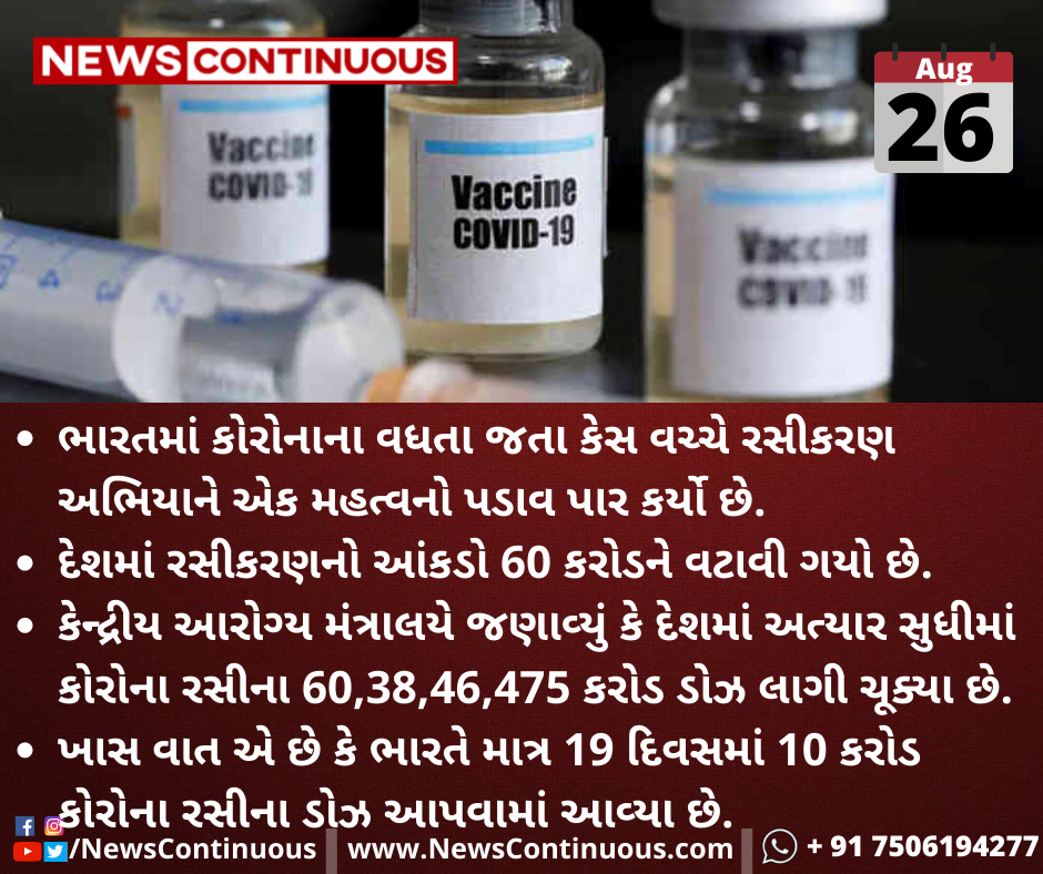 દેશમાં રસીકરણનો આંકડો 60 કરોડને વટાવી ગયો છે.