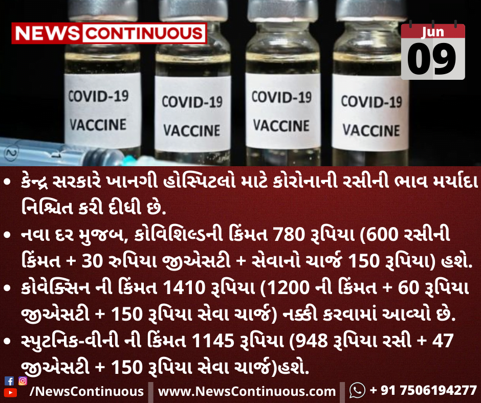 નવા દર મુજબ, કોવિશિલ્ડની કિંમત 780 રૂપિયા (600 રસીની કિંમત + 30 રુપિયા જીએસટી + સેવાનો ચાર્જ 150 રૂપિયા) હશે.