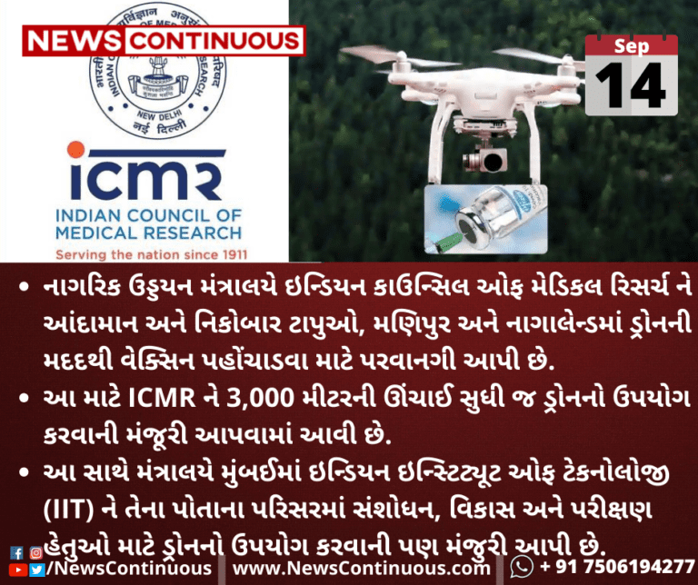 નાગરિક ઉડ્ડયન મંત્રાલયે ઇન્ડિયન કાઉન્સિલ ઓફ મેડિકલ રિસર્ચ ને આંદામાન અને નિકોબાર ટાપુઓ, મણિપુર અને નાગાલેન્ડમાં ડ્રોનની મદદથી વેક્સિન પહોંચાડવા માટે પરવાનગી આપી છે.