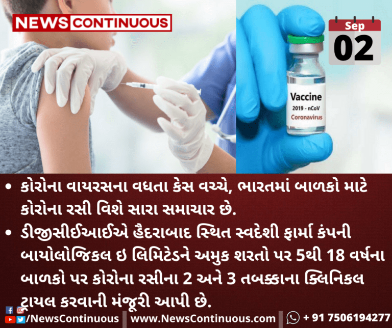 ડીજીસીઈઆઈએ હૈદરાબાદ સ્થિત સ્વદેશી ફાર્મા કંપની બાયોલોજિકલ ઇ લિમિટેડને અમુક શરતો પર 5થી 18 વર્ષના બાળકો પર કોરોના રસીના 2 અને 3 તબક્કાના ક્લિનિકલ ટ્રાયલ કરવાની મંજૂરી આપી છે.