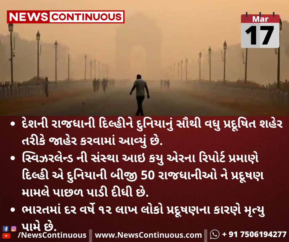સ્વિઝરલેન્ડ ની સંસ્થા આઇ કયુ એરના રિપોર્ટ પ્રમાણે દિલ્હી એ દુનિયાની બીજી 50 રાજધાનીઓ ને પ્રદૂષણ મામલે પાછળ પાડી દીધી છે.
