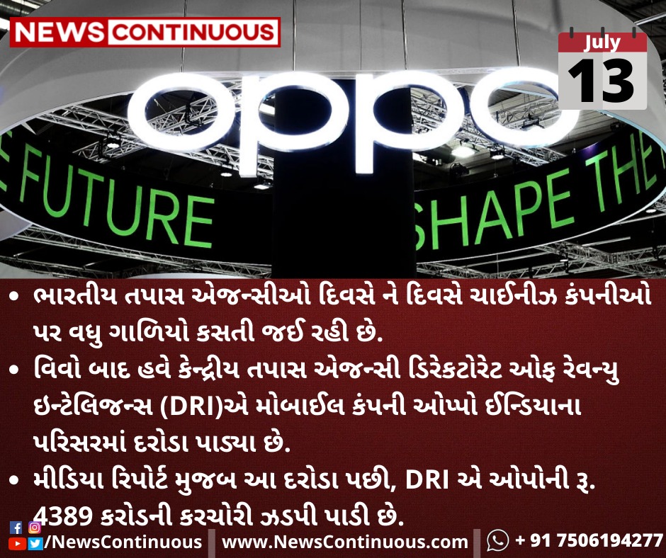 વિવો(Vivo) બાદ હવે કેન્દ્રીય તપાસ એજન્સી ડિરેકટોરેટ ઓફ રેવન્યુ ઇન્ટેલિજન્સ (DRI)એ મોબાઈલ કંપની ઓપ્પો ઈન્ડિયા(Oppo India)ના પરિસરમાં દરોડા પાડ્યા છે.