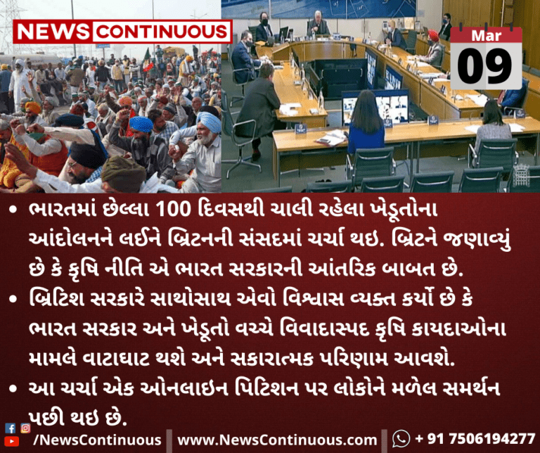 ભારતમાં છેલ્લા 100 દિવસથી ચાલી રહેલા ખેડૂતોના આંદોલનને લઈને બ્રિટનની સંસદમાં ચર્ચા થઇ બ્રિટને જણાવ્યું છે કે કૃષિ નીતિ એ ભારત સરકારની આંતરિક બાબત છે. બ્રિટિશ સરકારે સાથોસાથ એવો વિશ્વાસ વ્યક્ત કર્યો છે કે ભારત સરકાર અને ખેડૂતો વચ્ચે વિવાદાસ્પદ કૃષિ કાયદાઓના મામલે વાટાઘાટ થશે અને સકારાત્મક પરિણામ આવશે.