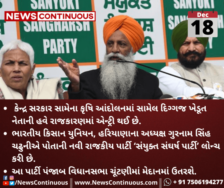 ભારતીય કિસાન યુનિયન, હરિયાણાના અધ્યક્ષ ગુરનામ સિંહ ચઢુનીએ પોતાની નવી રાજકીય પાર્ટી ‘સંયુક્ત સંઘર્ષ પાર્ટી’ લોન્ચ કરી છે.