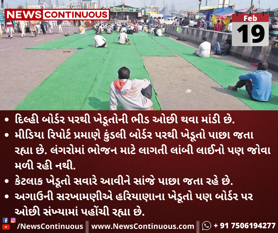 દિલ્હી બોર્ડર પરથી ખેડૂતોની ભીડ ઓછી થવા માંડી છે.મીડિયા રિપોર્ટ પ્રમાણે કુંડલી બોર્ડર પરથી ખેડૂતો પાછા જતા રહ્યા છે. લંગરોમાં ભોજન માટે લાગતી લાંબી લાઈનો પણ જોવા મળી રહી નથી.
