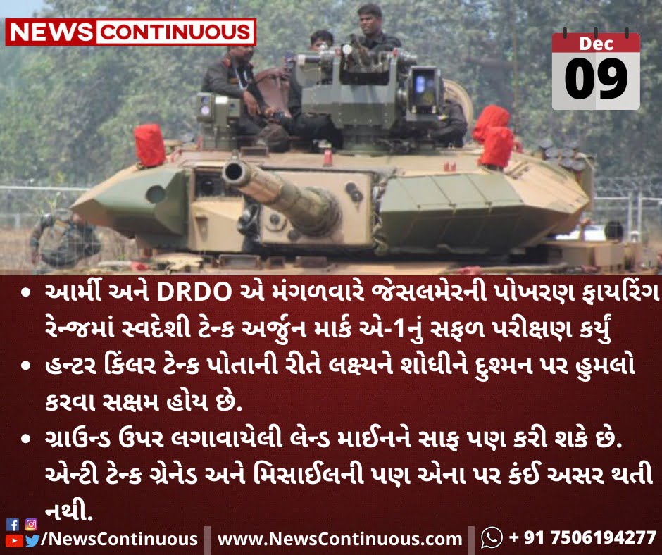 પોખરણમાં સ્વદેશી ટેન્ક અર્જુન માર્ક એ-1નું સફળ પરીક્ષણ, પોતાની રીતે લક્ષ્ય શોધી હુમલો કરશે આ ટેંક. જાણો વિગત અહીં.