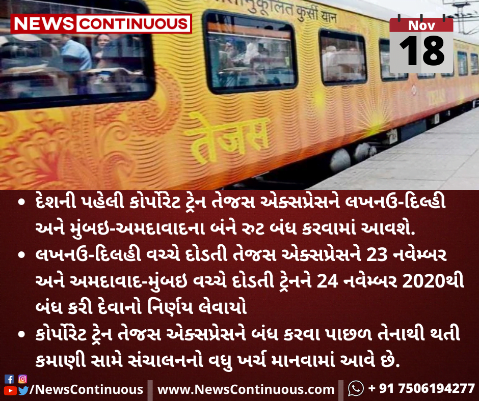 દેશની પ્રથમ કોર્પોરેટ ટ્રેન તેજસ એક્સપ્રેસને બંધ કરવામાં આવશે. જાણો વિગત.