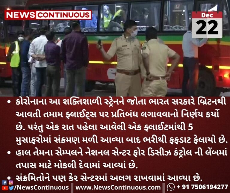 - કોરોનાના આ શક્તિશાળી સ્ટ્રેનને જોતા ભારત સરકારે બ્રિટનથી આવતી તમામ ફ્લાઈટ્સ પર પ્રતિબંધ લગાવવાનો નિર્ણય કર્યો છે. પરંતુ એક રાત પહેલા આવેલી એક ફ્લાઈટમાંથી 5 મુસાફરોમાં સંક્રમણ મળી આવ્યા બાદ ભરીથી ફફડાટ ફેલાયો છે.