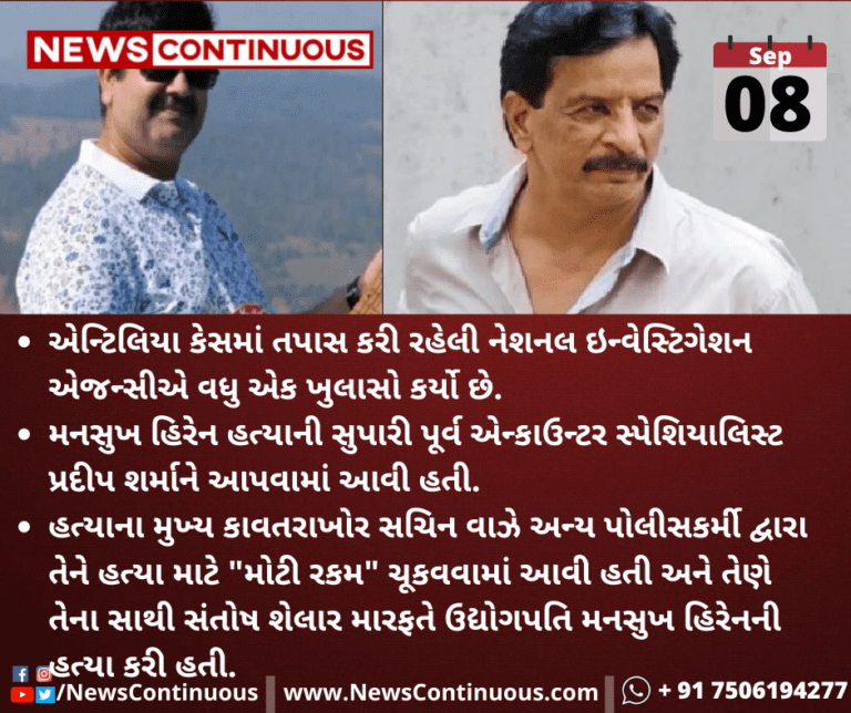 મનસુખ હિરેન હત્યાની સુપારી પૂર્વ એન્કાઉન્ટર સ્પેશિયાલિસ્ટ પ્રદીપ શર્માને આપવામાં આવી હતી.