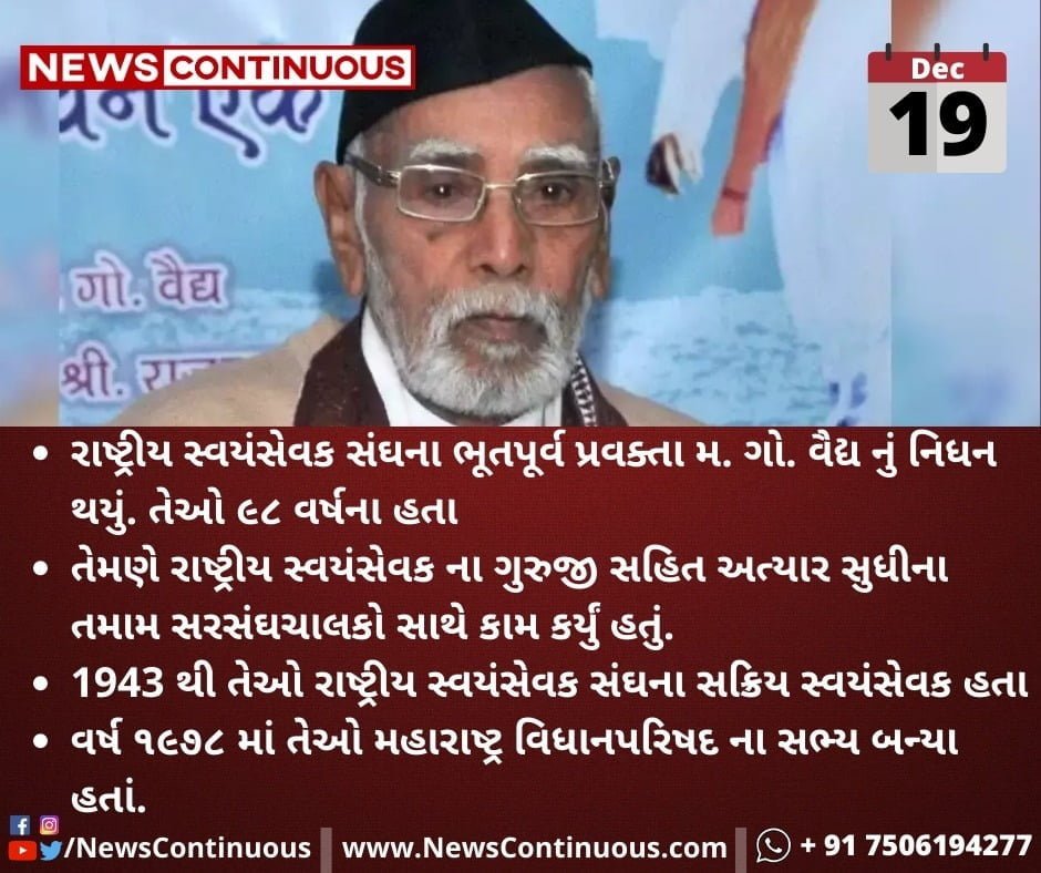 - રાષ્ટ્રીય સ્વયંસેવક સંઘના ભૂતપૂર્વ પ્રવક્તા મ. ગો. વૈધ નું નિધન થયું. તેઓ 98 વર્ષના હતા.