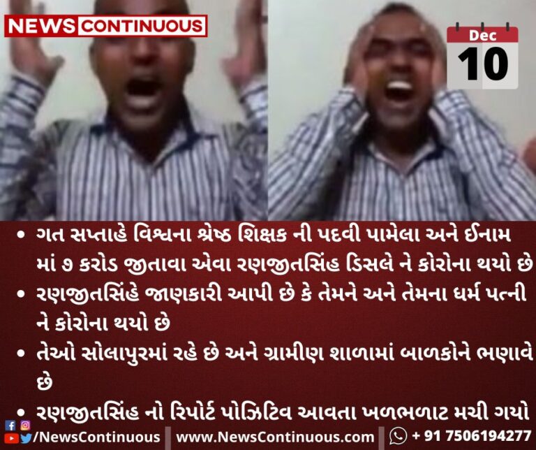 - ગત સપ્તાહે વિશ્વના શ્રેષ્ઠ શિક્ષક ની પદવી પામેલા અને ઈનામ માં ૭ કરોડ જીતાવા એવા રણજીતસિંહ ડિસલે ને કોરોના થયો છે