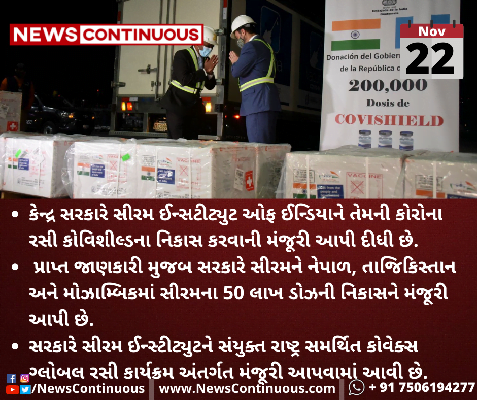 પ્રાપ્ત જાણકારી મુજબ સરકારે સીરમને નેપાળ, તાજિકિસ્તાન અને મોઝામ્બિકમાં સીરમના 50 લાખ ડોઝની નિકાસને મંજૂરી આપી છે.