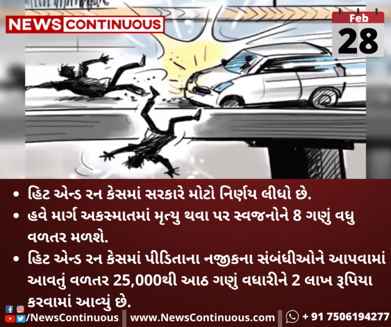 હિટ એન્ડ રન કેસમાં પીડિતાના નજીકના સંબંધીઓને આપવામાં આવતું વળતર 25,000થી આઠ ગણું વધારીને 2 લાખ રૂપિયા કરવામાં આવ્યું છે.