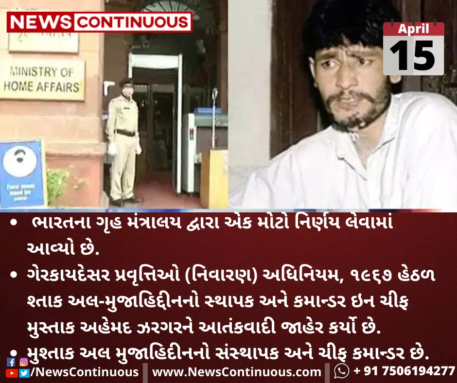 ગેરકાયદેસર પ્રવૃત્તિઓ (નિવારણ) અધિનિયમ, ૧૯૬૭ હેઠળ શ્તાક અલ-મુજાહિદ્દીનનો સ્થાપક અને કમાન્ડર ઇન ચીફ મુસ્તાક અહેમદ ઝરગરને આતંકવાદી જાહેર કર્યો છે.