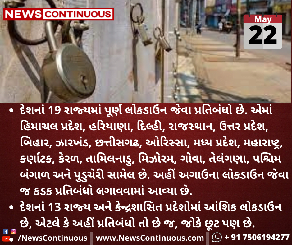 દેશનાં 19 રાજ્યમાં પૂર્ણ લોકડાઉન જેવા પ્રતિબંધો છે. એમાં હિમાચલ પ્રદેશ, હરિયાણા, દિલ્હી, રાજસ્થાન, ઉત્તર પ્રદેશ, બિહાર, ઝારખંડ, છત્તીસગઢ, ઓરિસ્સા, મધ્ય પ્રદેશ, મહારાષ્ટ્ર, કર્ણાટક, કેરળ, તામિલનાડુ, મિઝોરમ, ગોવા, તેલંગણા, પશ્ચિમ બંગાળ અને પુડુચેરી સામેલ છે. અહીં અગાઉના લોકડાઉન જેવા જ કડક પ્રતિબંધો લગાવવામાં આવ્યા છે.