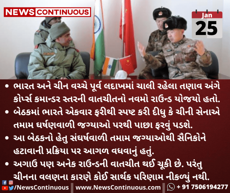 ભારત અને ચીન વચ્ચે પૂર્વ લદાખમાં ચાલી રહેલા તણાવ અંગે લગભગ અઢી મહિના બાદ કોર્પ્સ કમાન્ડર સ્તરની વાતચીતનો નવમો રાઉન્ડ યોજયો હતો
