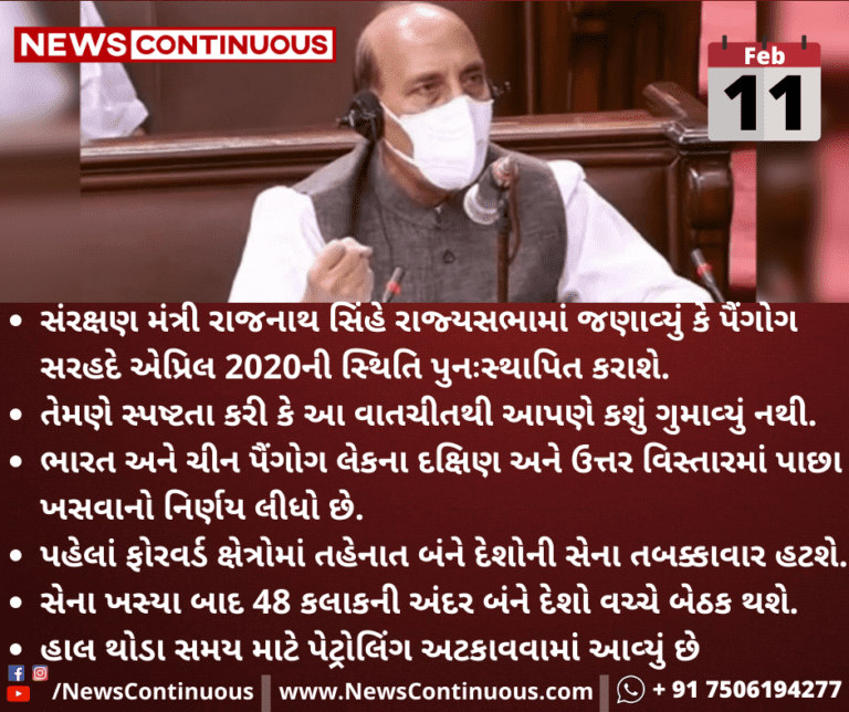 સંરક્ષણ મંત્રી રાજનાથ સિંહે રાજ્યસભામાં જણાવ્યું કે પૈંગોગ સરહદે એપ્રિલ 2020ની સ્થિતિ પુનઃસ્થાપિત કરાશે.