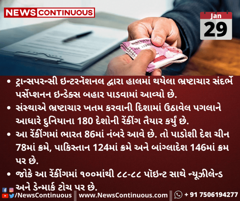 ટ્રાન્સપરન્સી ઇન્ટરનૅશનલ દ્વારા હાલમાં થયેલા ભ્રષ્ટાચાર સંદર્ભે પર્સેપ્શનન ઇન્ડેક્સ બહાર પાડવામાં આવ્યો છે. સંસ્થાએ ભ્રષ્ટાચાર ખતમ કરવાની દિશામાં ઉઠાવેલ પગલાને આધારે દુનિયાના 180 દેશોની રેંકીંગ તૈયાર કર્યું છે.