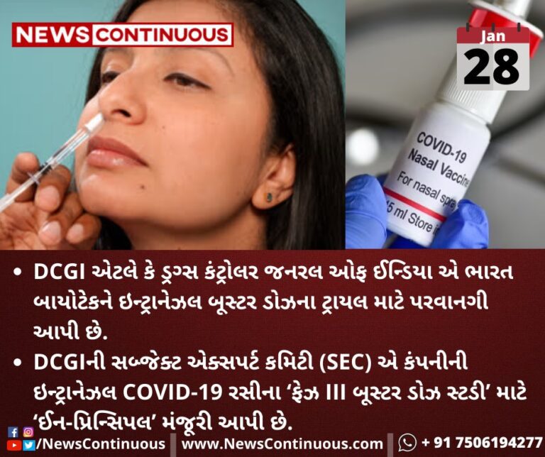 DCGIની સબ્જેક્ટ એક્સપર્ટ કમિટી (SEC) એ કંપનીની ઇન્ટ્રાનેઝલ COVID-19 રસીના ‘ફેઝ III બૂસ્ટર ડોઝ સ્ટડી’ માટે ‘ઈન-પ્રિન્સિપલ’ મંજૂરી આપી છે.