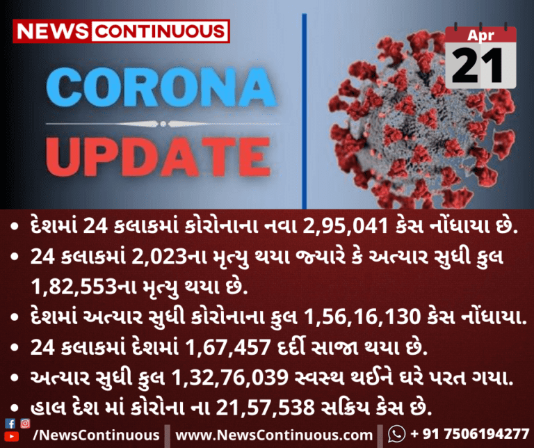 દેશમાં 24 કલાકમાં કોરોનાના નવા 2,95,041 કેસ નોંધાયા છે.