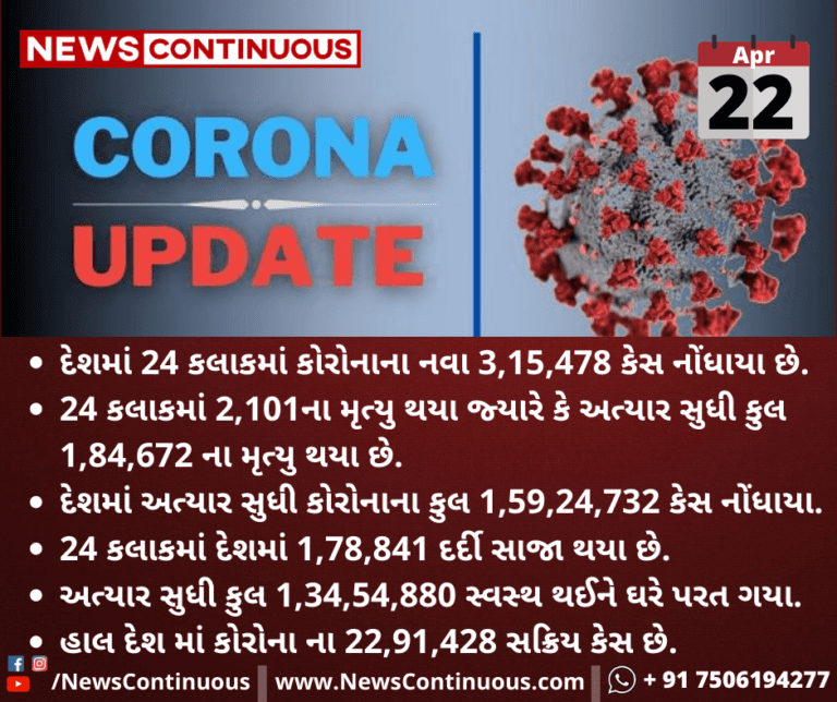 દેશમાં 24 કલાકમાં કોરોનાના નવા 3,15,478 કેસ નોંધાયા છે.