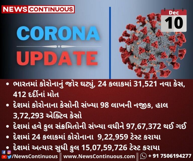 - ભારતમાં કોરોનાનું જોર ઘટ્યું, 24 કલાકમાં 31,521 નવા કેસ, 412 દર્દીનાં મોત.