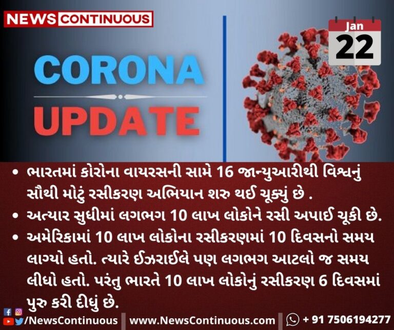 અમેરિકામાં 10 લાખ લોકોના રસીકરણમાં 10 દિવસનો સમય લાગ્યો હતો. ત્યારે ઈઝરાઈલે પણ લગભગ આટલો જ સમય લીધો હતો. પરંતુ ભારતે 10 લાખ લોકોનું રસીકરણ 6 દિવસમાં પુરુ કરી દીધું છે.