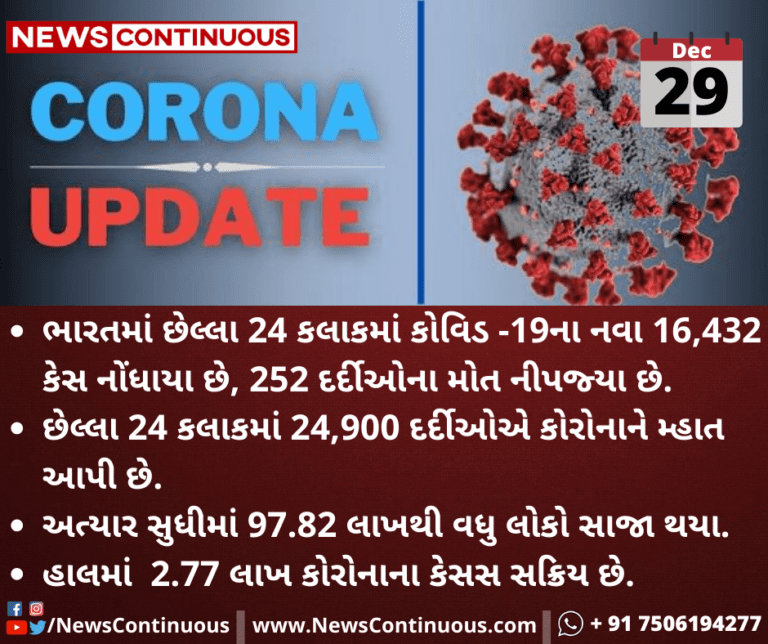 - ભારતમાં છેલ્લા 24 કલાકમાં કોવિડ -19ના નવા 16,432 કેસ નોંધાયા છે, 252 દર્દીઓના મોત નીપજ્યા છે.