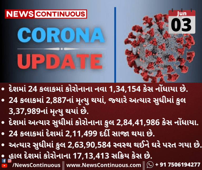 દેશમાં 24 કલાકમાં કોરોનાના નવા 1,34,154 કેસ નોંધાયા છે.