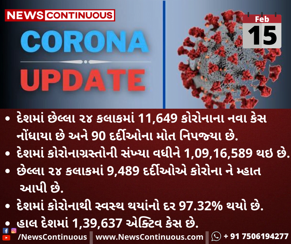 દેશમાં છેલ્લા ૨૪ કલાકમાં 11,649 કોરોનાના નવા કેસ નોંધાયા છે અને 90 દર્દીઓના મોત નિપજ્યા છે
