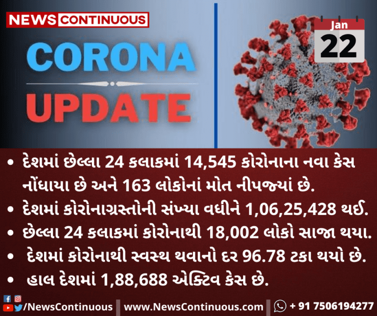 દેશમાં કોરોનાગ્રસ્તોની સંખ્યા વધીને 1,06,25,428 થઈ છે.