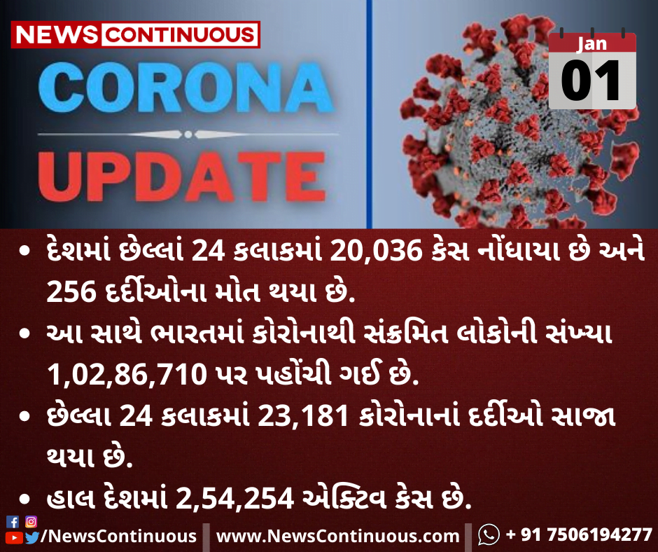 દેશમાં છેલ્લાં 24 કલાકમાં 20,036 કેસ નોંધાયા છે અને 256 દર્દીઓના મોત થયા છે