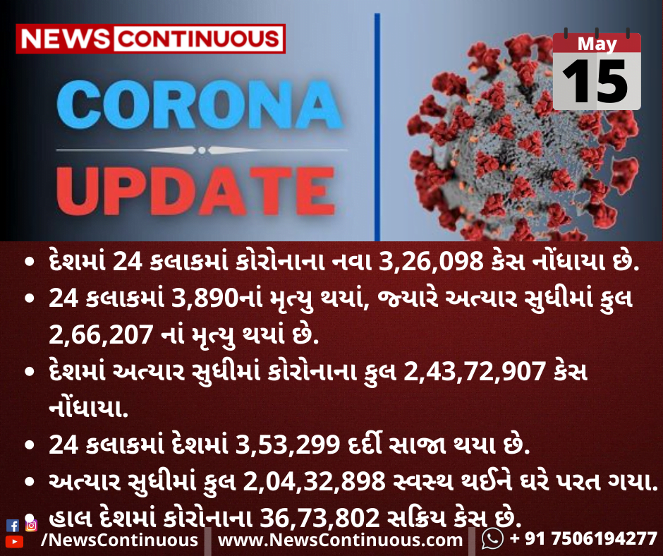 દેશમાં 24 કલાકમાં કોરોનાના નવા 3,26,098 કેસ નોંધાયા છે.