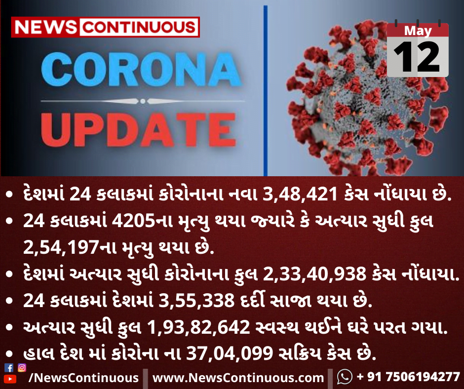 દેશમાં 24 કલાકમાં કોરોનાના નવા 3,48,421 કેસ નોંધાયા છે.