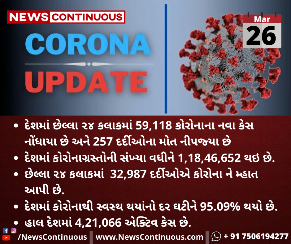 દેશમાં છેલ્લા ૨૪ કલાકમાં 59,118 કોરોનાના નવા કેસ નોંધાયા છે અને 257 દર્દીઓના મોત નીપજ્યા છે
