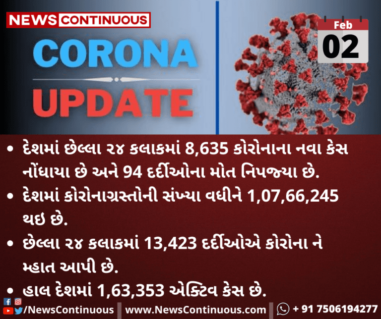 દેશમાં છેલ્લા ૨૪ કલાકમાં 8,635 કોરોનાના નવા કેસ નોંધાયા છે અને 94 દર્દીઓના મોત નિપજ્યા છે