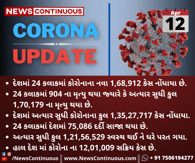 દેશમાં 24 કલાકમાં કોરોનાના નવા 1,68,912 કેસ નોંધાયા છે.