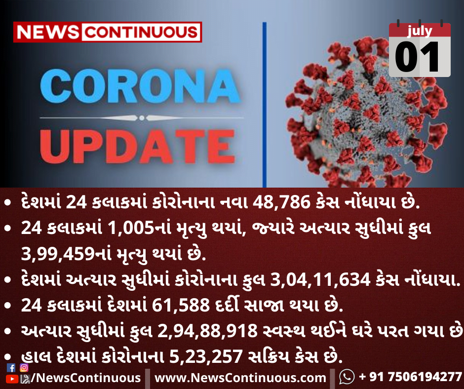 દેશમાં 24 કલાકમાં કોરોનાના નવા 48,786 કેસ નોંધાયા છે.