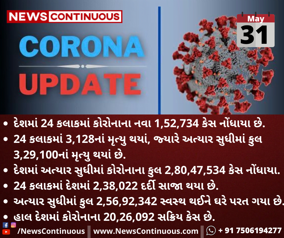 દેશમાં 24 કલાકમાં કોરોનાના નવા 1,52,734 કેસ નોંધાયા છે.