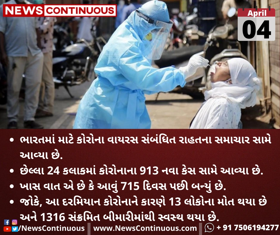 છેલ્લા 24 કલાકમાં કોરોનાના 913 નવા કેસ સામે આવ્યા છે.