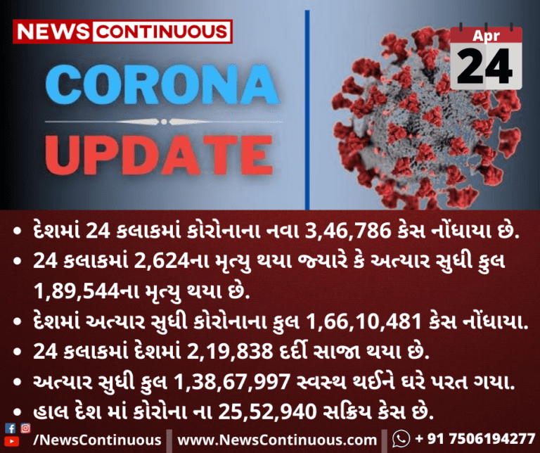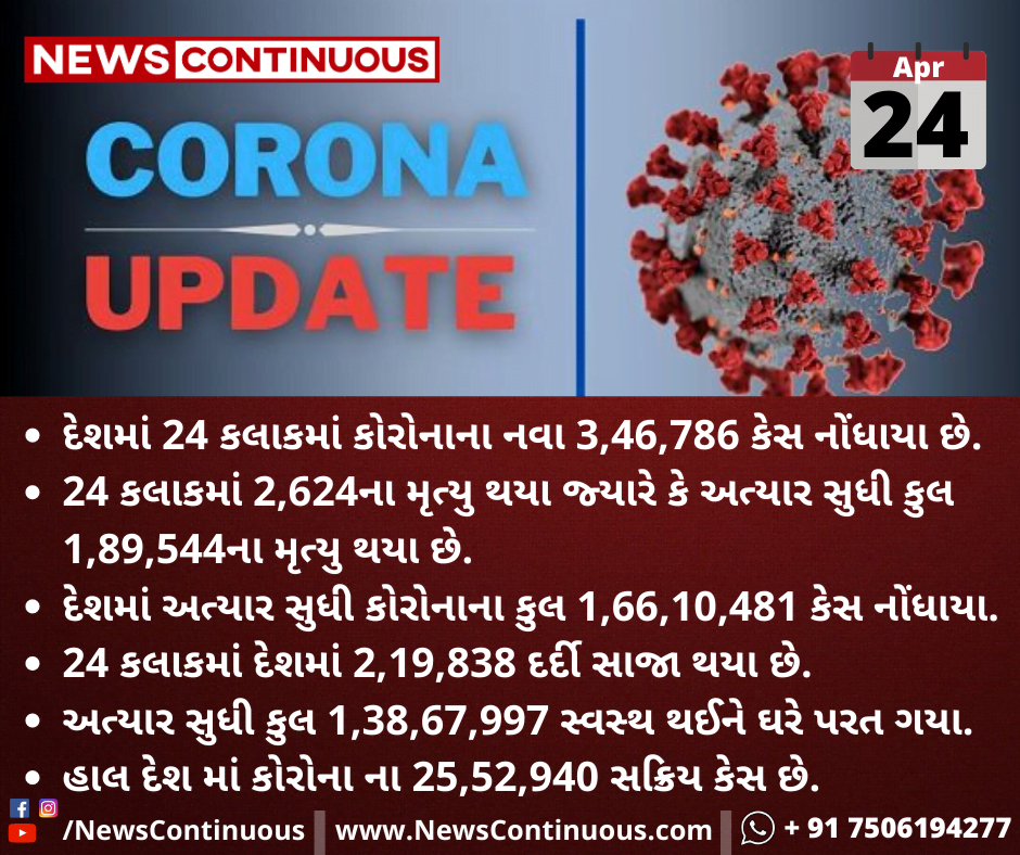 દેશમાં 24 કલાકમાં કોરોનાના નવા 3,46,786 કેસ નોંધાયા છે.