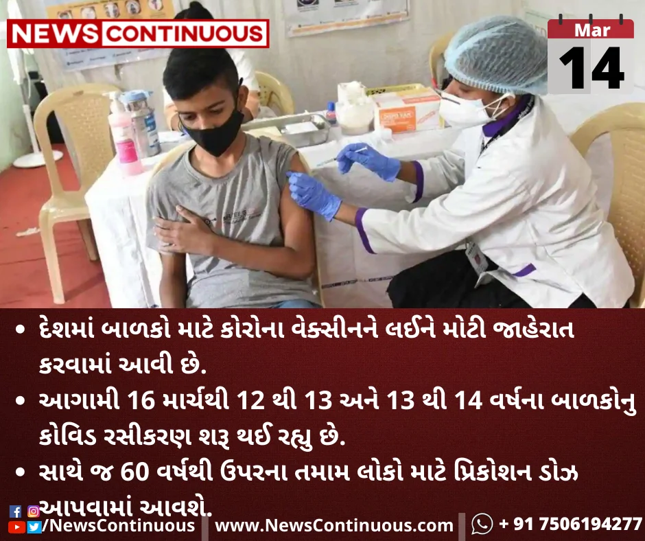 આગામી 16 માર્ચથી 12 થી 13 અને 13 થી 14 વર્ષના બાળકોનુ કોવિડ રસીકરણ શરૂ થઈ રહ્યુ છે.