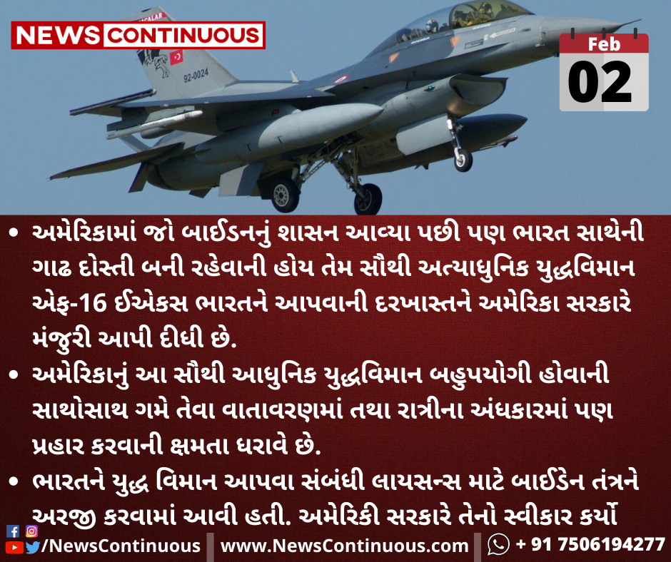 અમેરિકામાં જો બાઈડનનું શાસન આવ્યા પછી પણ ભારત સાથેની ગાઢ દોસ્તી બની રહેવાની હોય તેમ સૌથી અત્યાધુનિક યુદ્ધવિમાન એફ-16 ઈએકસ ભારતને આપવાની દરખાસ્તને અમેરિકા સરકારે મંજુરી આપી દીધી છે.