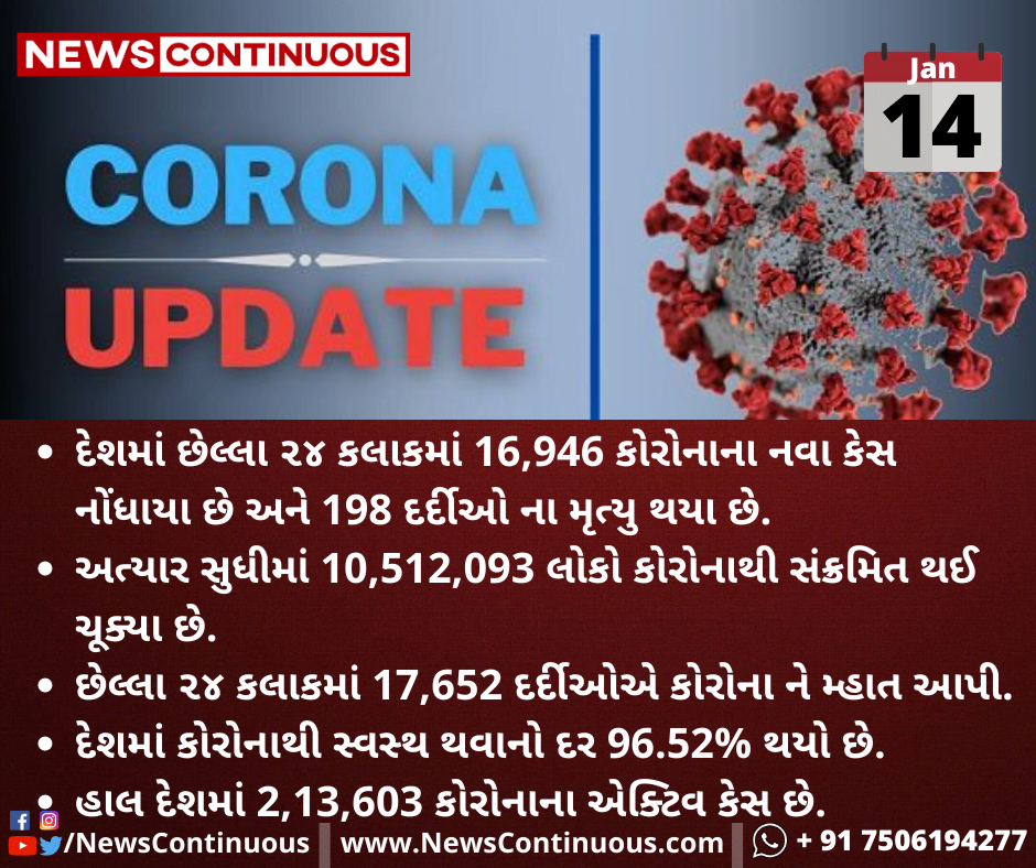 દેશમાં છેલ્લા ૨૪ કલાકમાં 16,946 કોરોનાના નવા કેસ નોંધાયા છે અને 198 દર્દીઓ ના મૃત્યુ થયા છે.