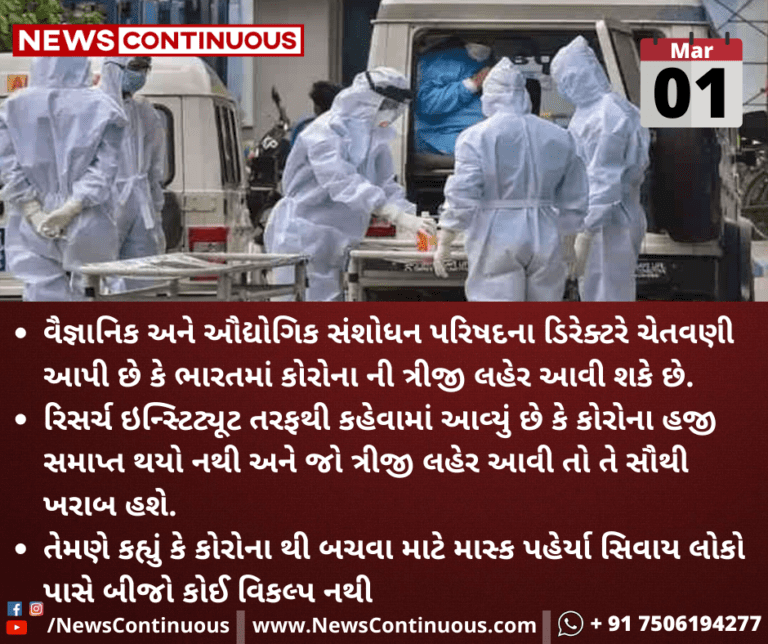વૈજ્ઞાનિક અને ઔદ્યોગિક સંશોધન પરિષદના ડિરેક્ટરે ચેતવણી આપી છે કે ભારતમાં કોરોના ની ત્રીજી લહેર આવી શકે છે