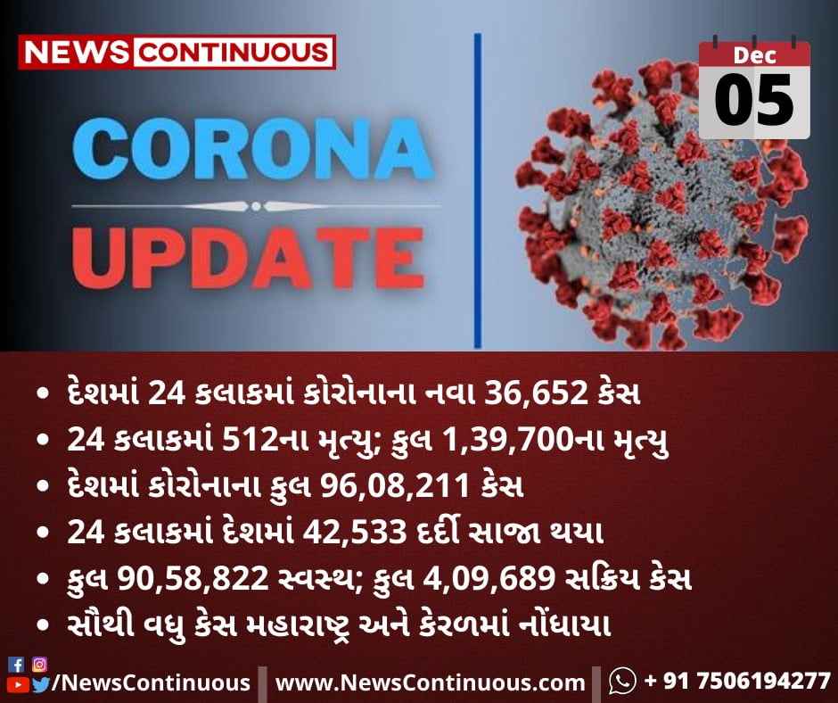 સારા સમાચાર : સતત સારો પાંચમો દિવસ. કોરોના ના કેસીસ ૪૦ હજાર થી નીચે રહ્યાં. પણ મહારાષ્ટ્ર નું પ્રદર્શન ખરાબ… જાણો વિગત
