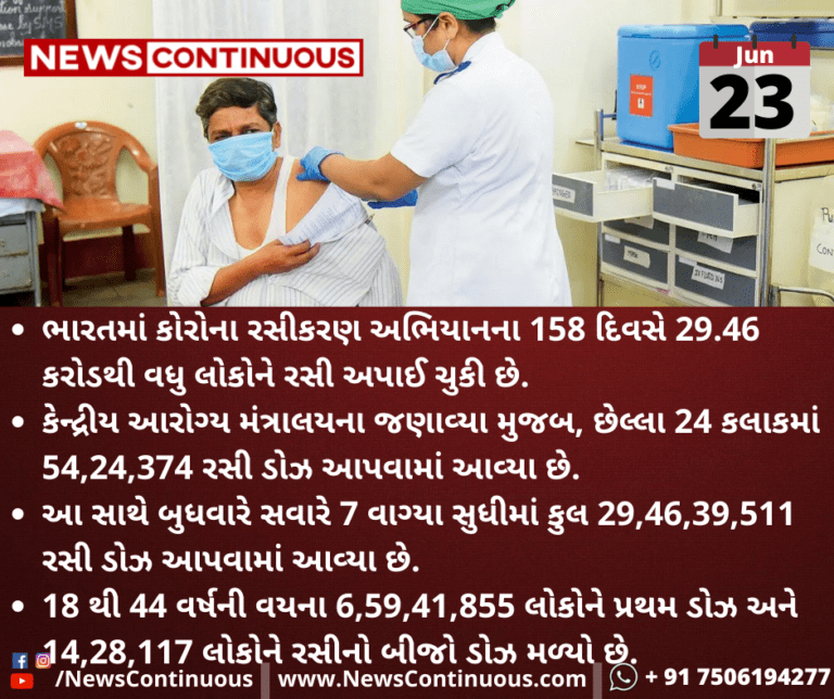 ભારતમાં કોરોના રસીકરણ અભિયાનના 158 દિવસે 29.46 કરોડથી વધુ લોકોને રસી અપાઈ ચુકી છે.