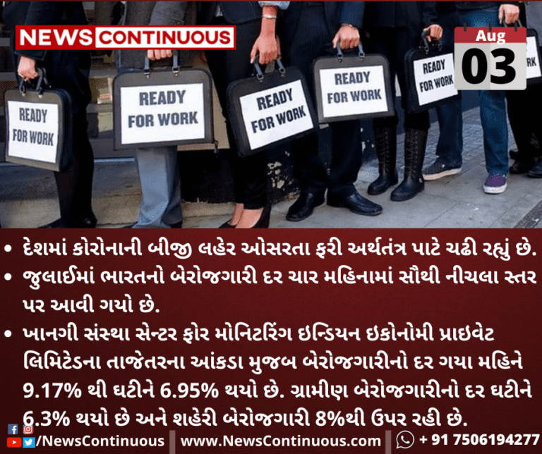 જુલાઈમાં ભારતનો બેરોજગારી દર ચાર મહિનામાં સૌથી નીચલા સ્તર પર આવી ગયો છે.