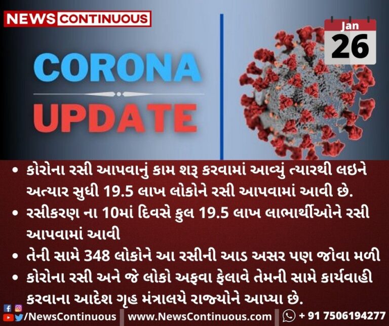 રસીકરણ ના 10માં દિવસે કુલ 19.5 લાખ લાભાર્થીઓને રસી આપવામાં આવી