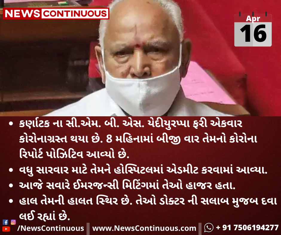- કર્ણાટક ના સી.એમ. બી. એસ. યેદીયુરપ્પા ફરી એકવાર કોરોનાગ્રસ્ત થયા છે. 8 મહિનામાં બીજી વાર તેમનો કોરોના રિપોર્ટ પોઝિટિવ આવ્યો છે.